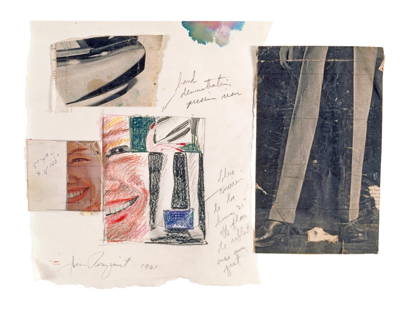 Sources and Preparatory Study for Look Alive (Blue Feet, Look Alive), 1961. Magazine clippings and mixed media on paper, with adventitious marks. 11" x 14 11/16" (27.9 x 37.3 cm). Collection of the Estate of James Rosenquist.