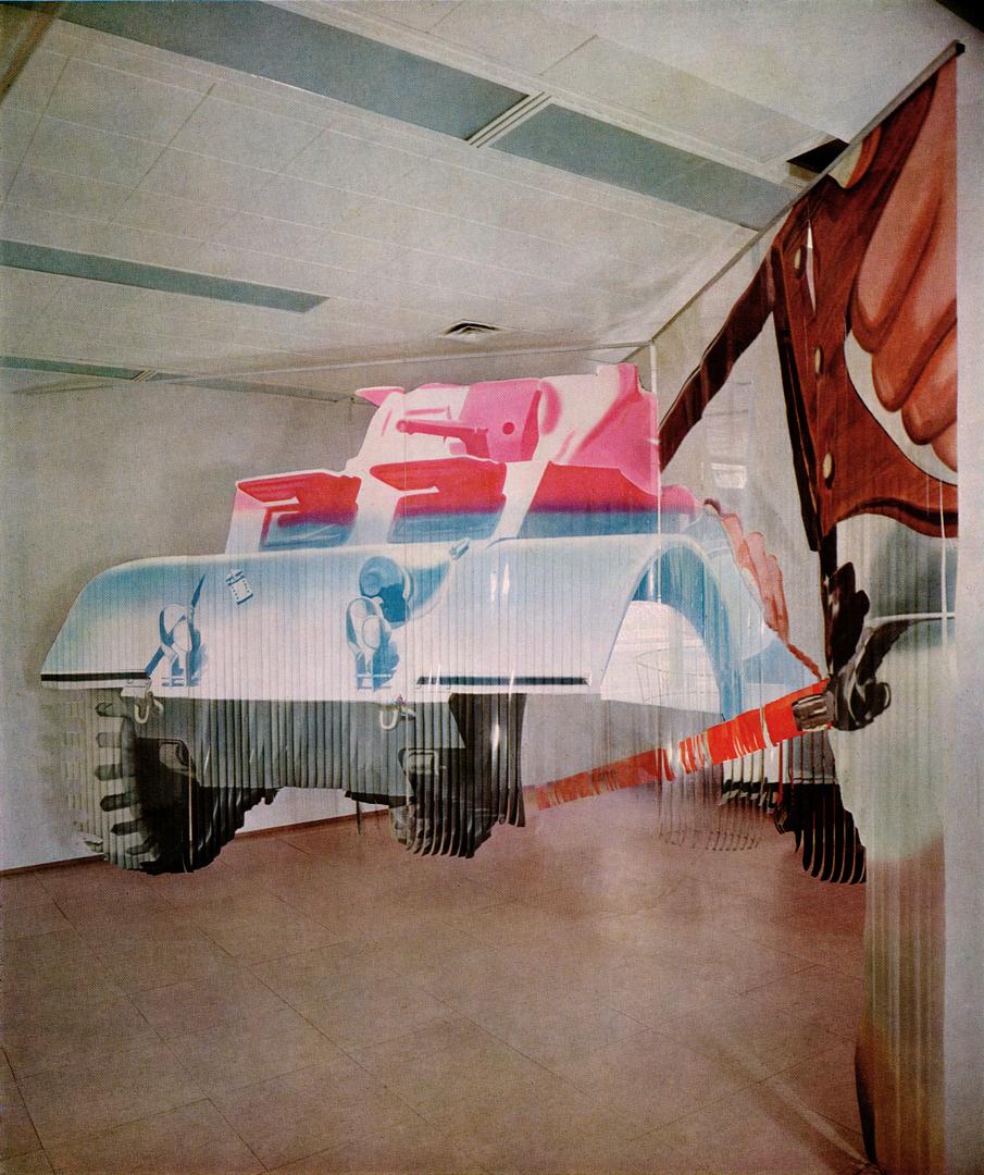 Forest Ranger, 1967. Oil on slit and shaped Mylar. Three panels (two intersecting and one freestanding), each approx. 114” (289.6 cm) in height. Museum Ludwig, Cologne. Donation from the Ludwig Collection 1976.