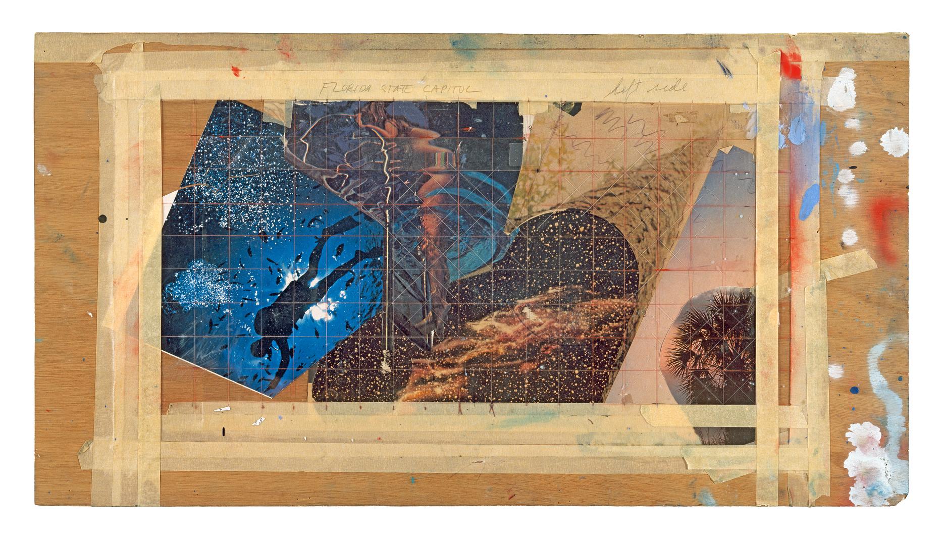 Source for the Left Panel of Tallahassee Murals, 1976. Collage and mixed media on plywood, with adventitious marks. 16 3/16" x 30" (41.1 x 76.2 cm). Collection of the Estate of James Rosenquist.